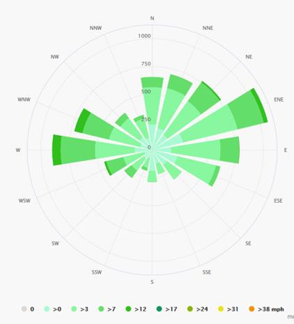 The prevailing hourly average wind direction in Jakarta varies across the year. The wind is predominantly from the east for 7.4 months (April to November) with a peak percentage of 70% in July. The wind is mainly from the west for 4.6 months (November to April) with the highest percentage of 67% in January.