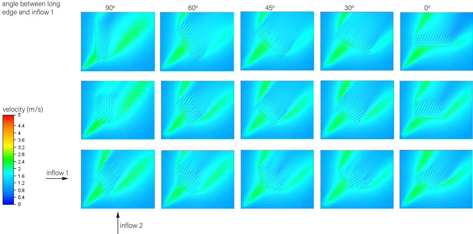 Initial CFD experiment has been carried out to explore effects that different geometry of building footprint and orientation have in terms of slowing flood flow and reducing impact on the embankment structures. The building outlines are generated with 3.6m x 3.6m building grid with staggering pattern, as derived in the previous section.
