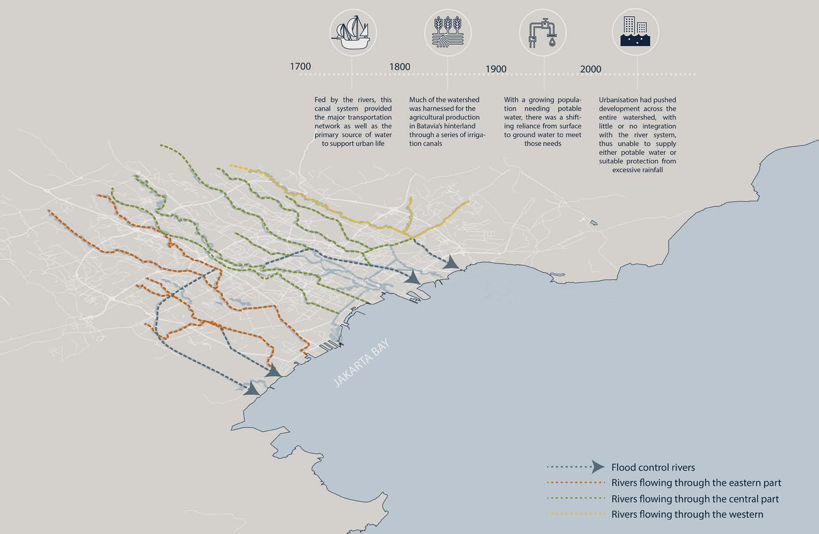 Located in a flood plain area, Jakarta has had a long history of flooding due to its geographical location on a low and flat alluvial plain of 13 rivers. Recurrent flood during monsoon seasons is a naturally occurring phenomenon. The floodplains, from being surrounded by rice paddy fields to an engineered system of canals have evolved with the city throughout history. The rivers also provided a major transportation network as well as the primary source of water at different times.