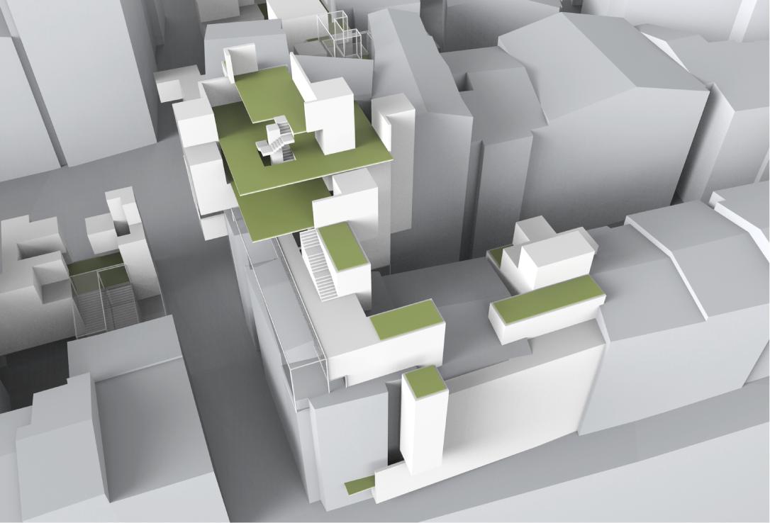 The research questions revolve around the problematic of building within very specific conditions. The project necessarily has to adapt to its highly restrictive immediate physical environment composed of streets, stairs, plazas and buildings, but also to its socioeconomic and environmental context.