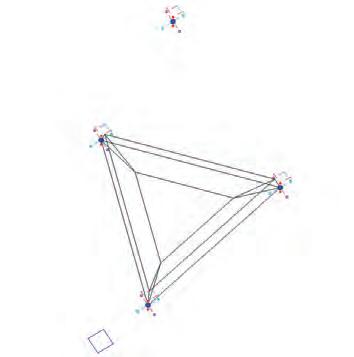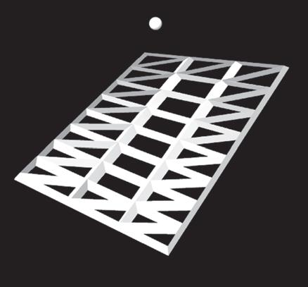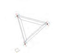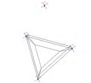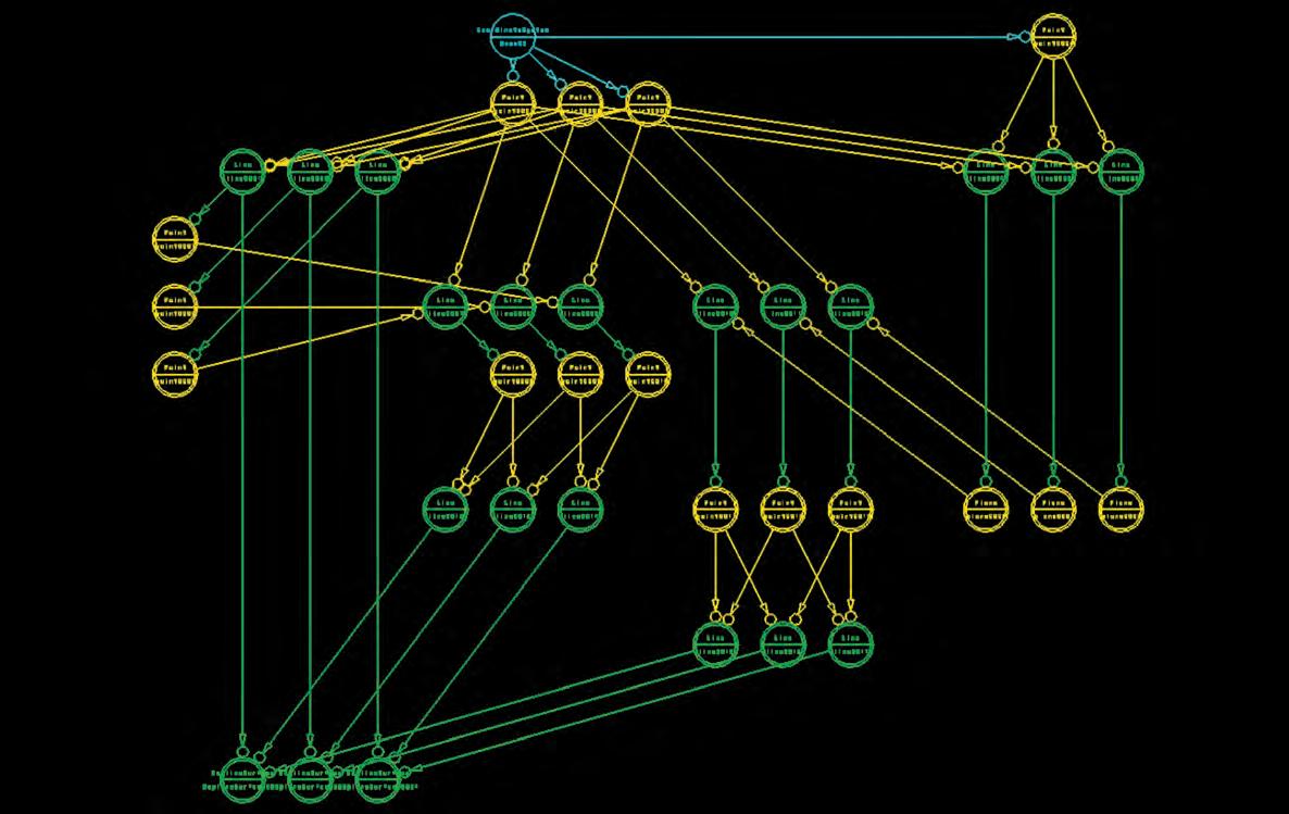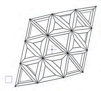 The second step was to nest the component inside a layered triangular organization of 38 features, generating a parametrically deformable triangular tile with regular pentagonal dodecahedra (12-sided) interior cellular partitions. This tile was a periodically distributed into a larger equilateral configuration with a total population of 152 nested component features. As an established parametric system, a procedure of external modification was introduced. With the isolated manipulation of one single input point, a re-configuration of 114 primary components resulted; maintaining the rigid cellular partition coherence while relocating the respected individual centroids.