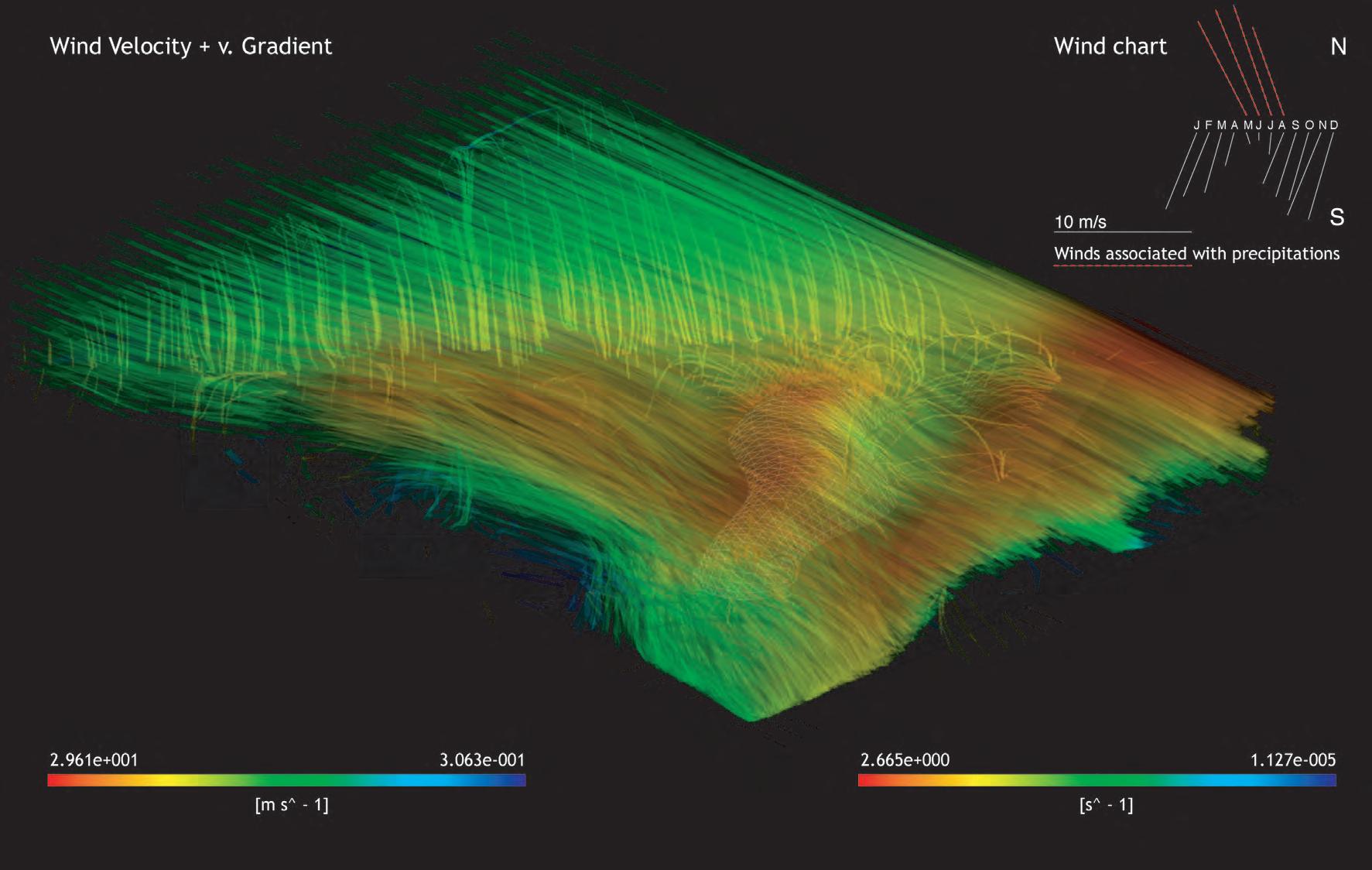 The project is driven towards the definition of a “Climatic Envelope”. The global output is layered and populated in a specific manner. The range of components and their location on the surface is the product of the hierarchical association derived from: Light, Air and Water