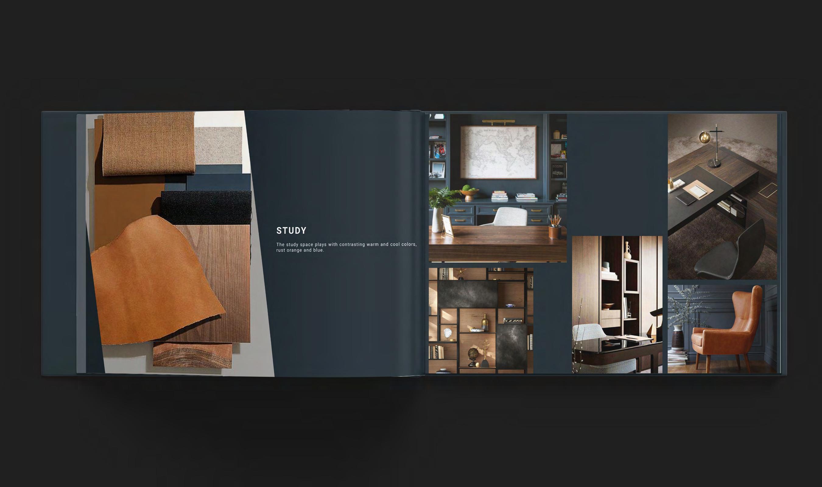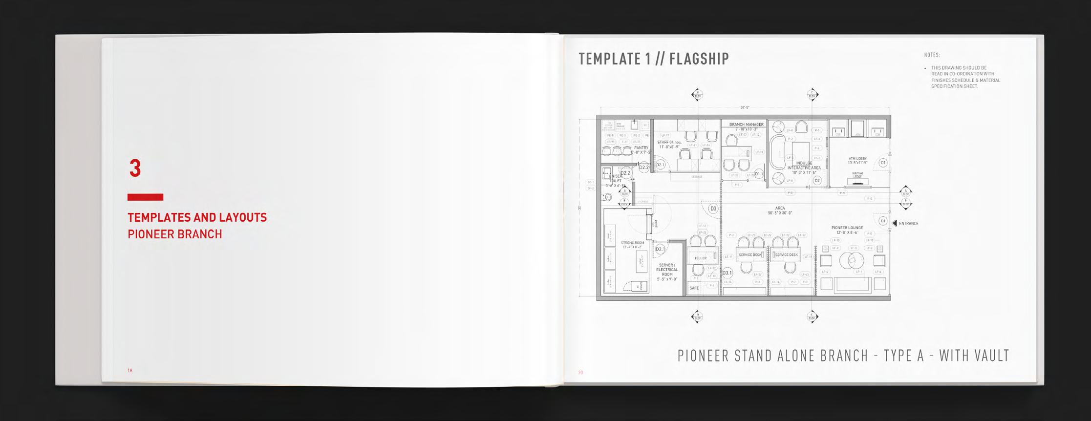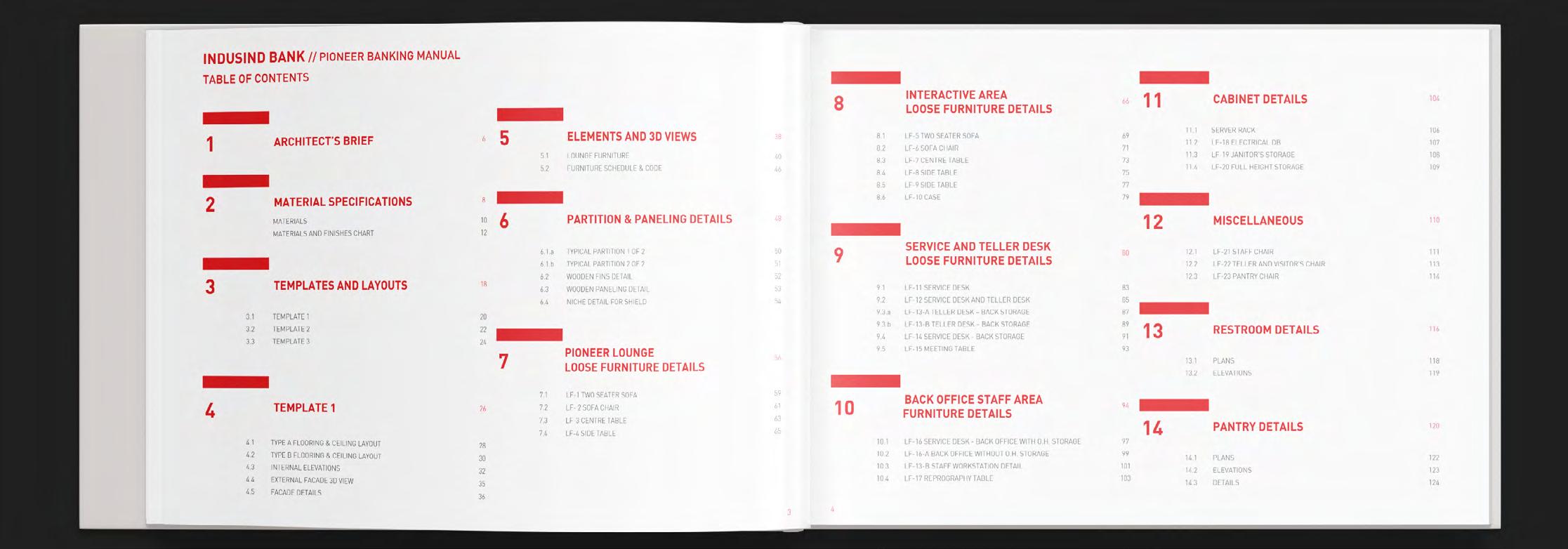 Design of a banking manual using furniture detail drawings laid out with titles and headers highlighted with a red band.