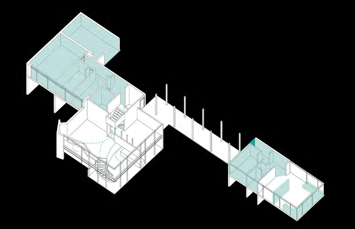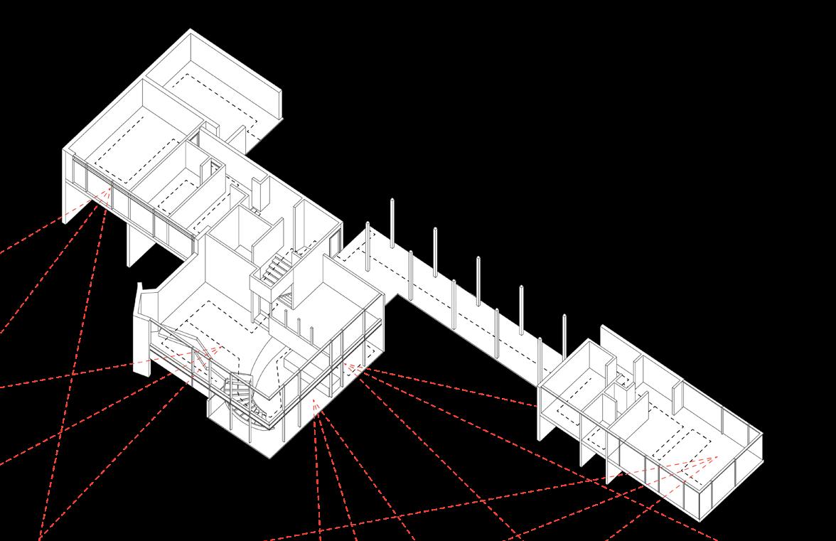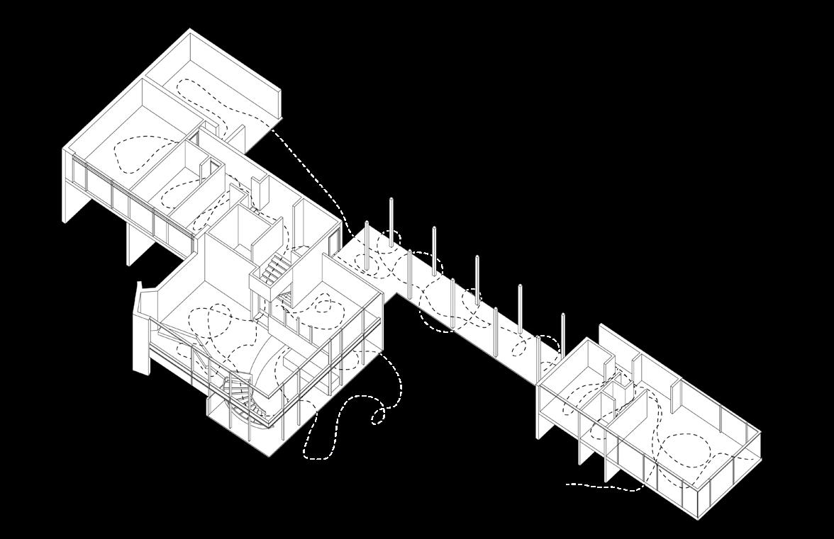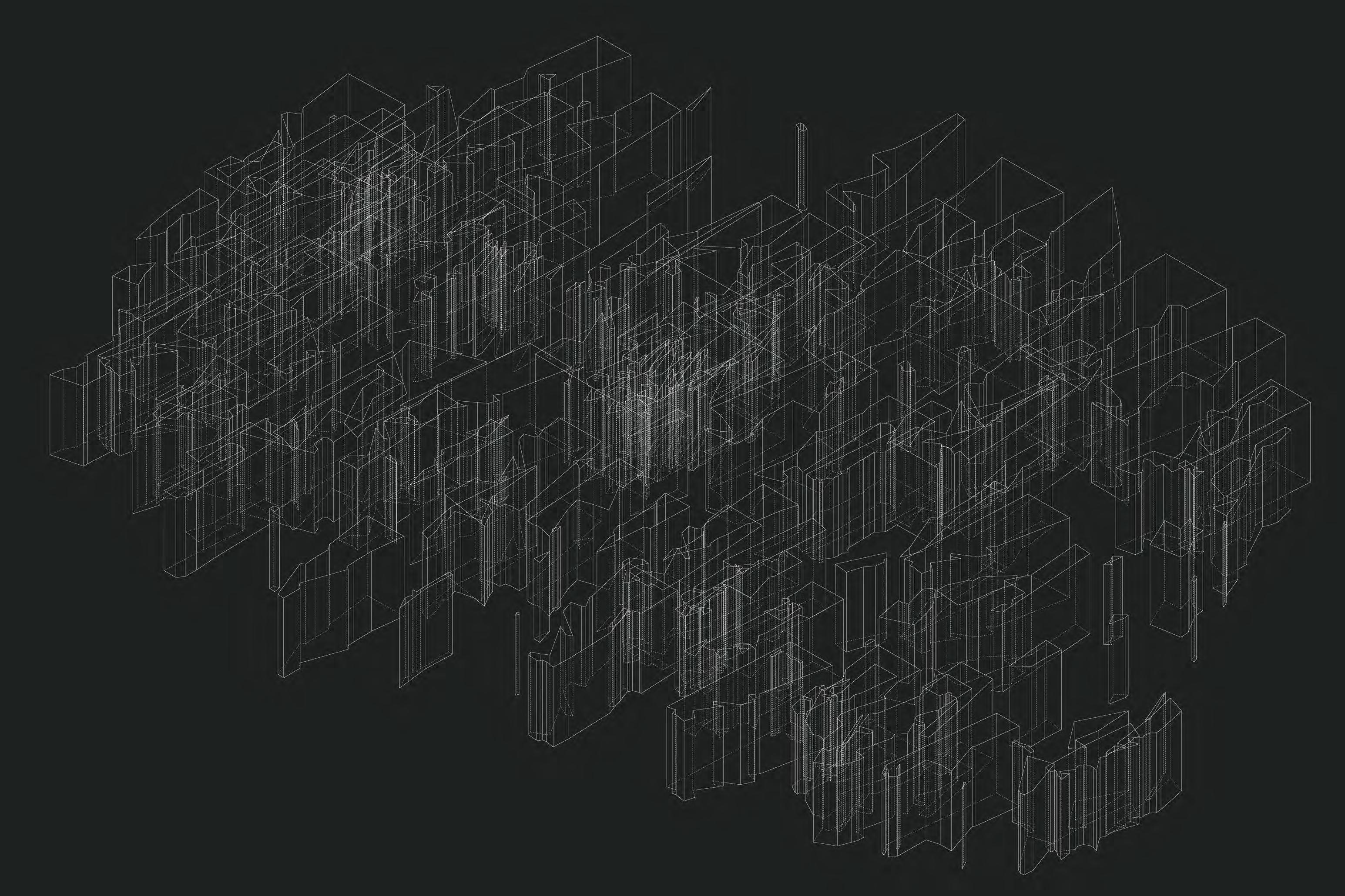 The concept for this drawing is “chaos theory”, which examines and redefines the existing function of interstitial spaces. The grasshopper script that generated the digital diagram was first used on puppets. This script was then applied to interstitial spaces to follow the puppet’s trajectory.