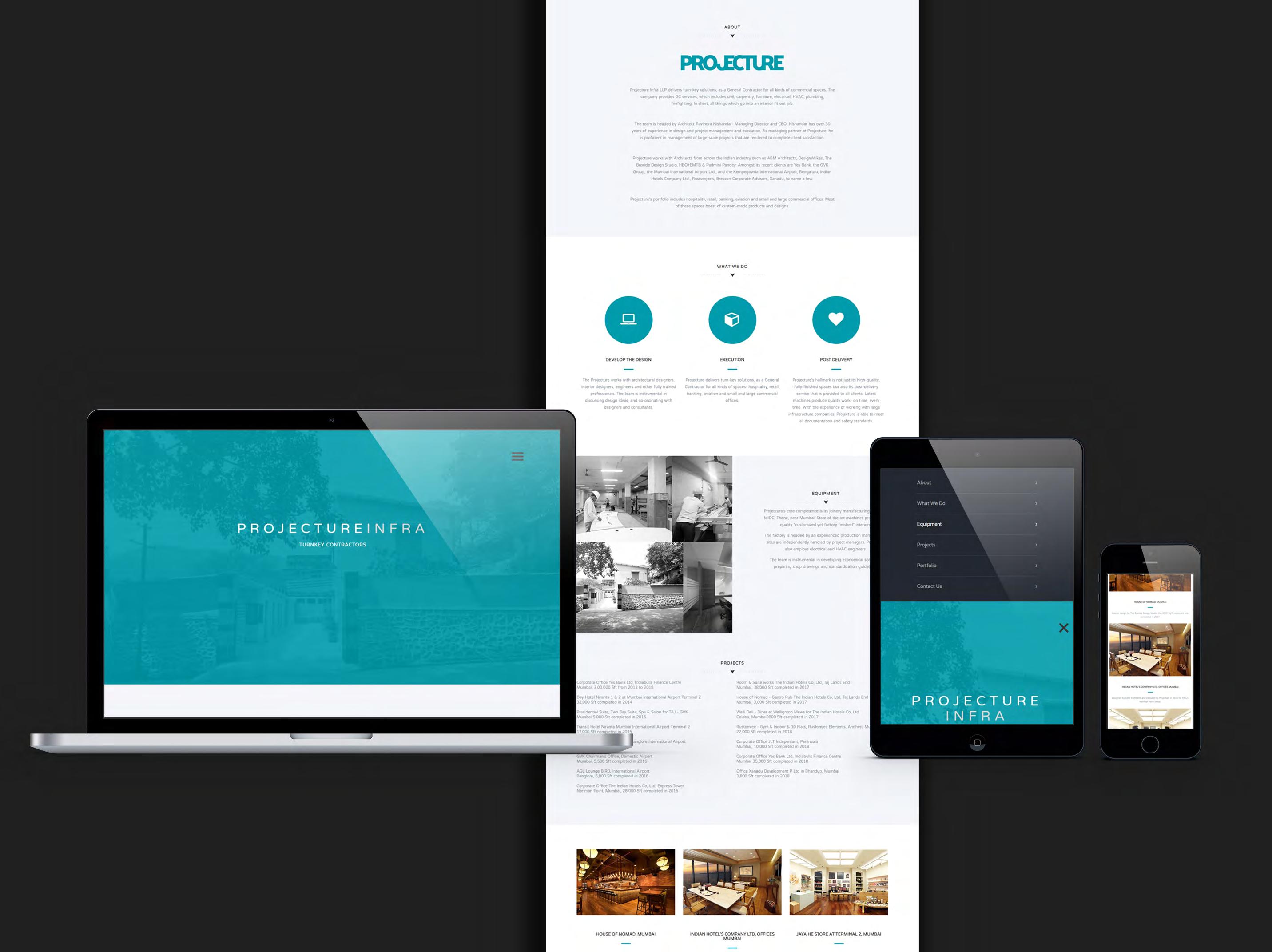 Website design for Projecture Infra a contracting firm in Mumbai. This one page responsive website is designed using the turquoise logo colors with a simple white and grey color scheme.