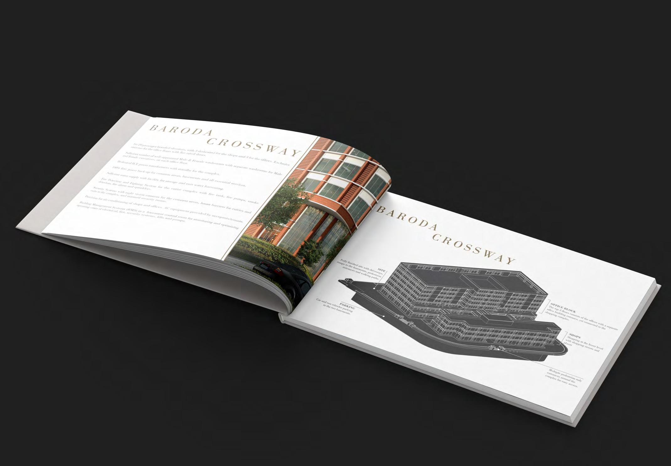 Brochure design for Baroda Crossway an upcoming high street shopping center in Baroda, India. The brochure combines text, images and axonometric drawings.