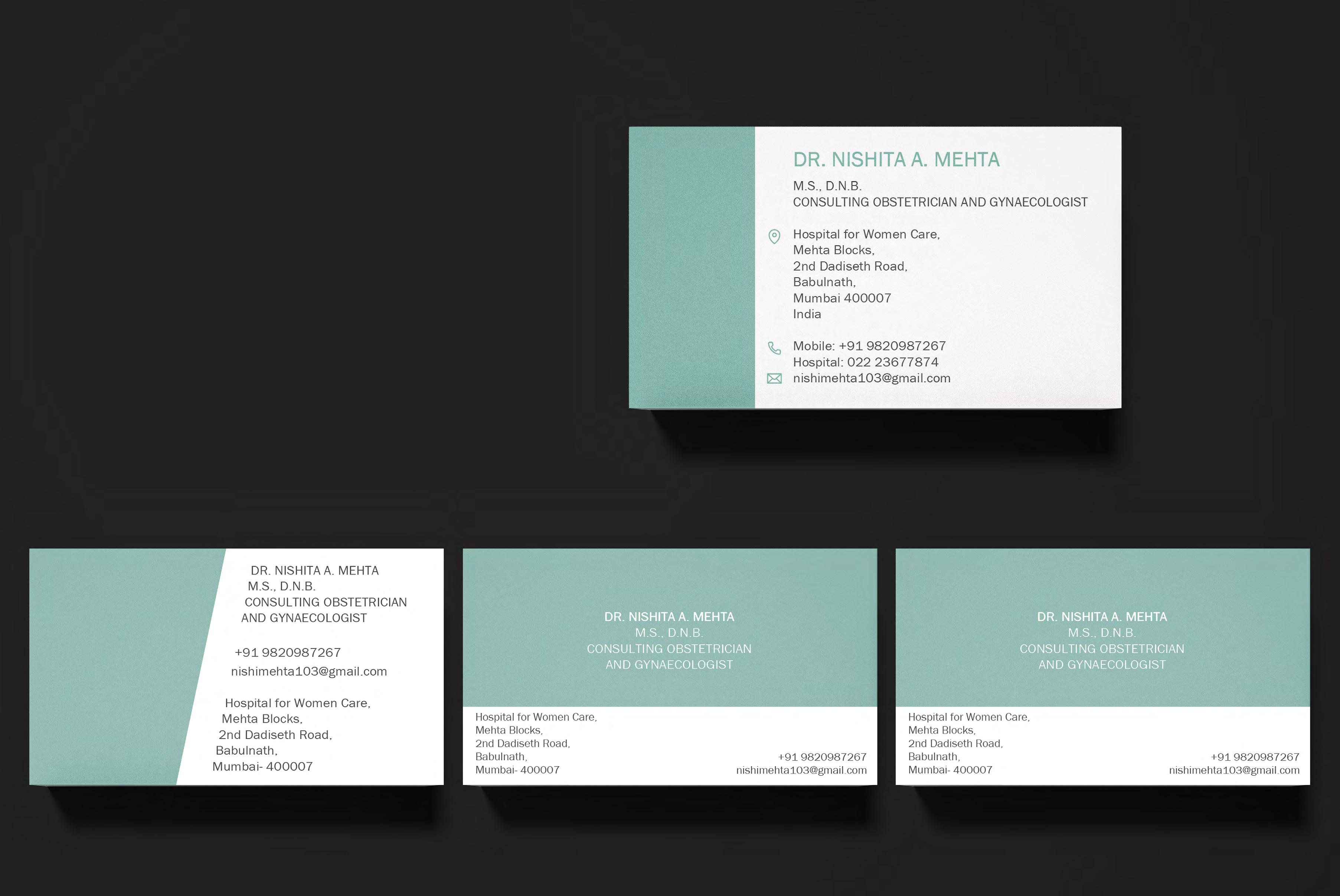 Design of business cards for Dr. Nishita Mehta. The layout is simple and text aligned to read clearly. The use of a sea green adds a hint of color to the card without distracting from the design. The image on the right is the final design, however alternate designs were explored.