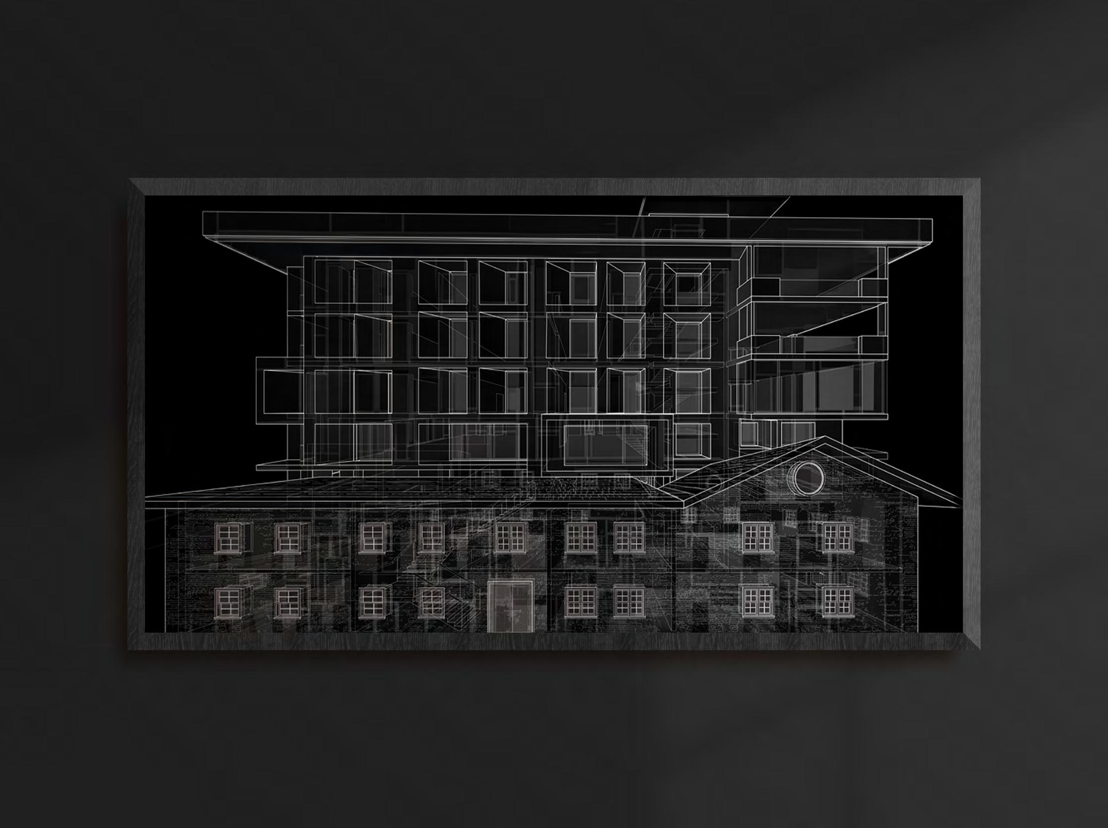 Building ruins manifests itself in an architectural section perspective drawing. The drawing depicts the mashup of two buildings – An old English building that is now demolished creeping over a contemporary multi-storey home. Overlaid with images generated by a neural network AI software, the images bridge the new and the old, and builds into the ruin. The drawings are a digital representation that uses 3 dimensional models, 2 dimensional line work and collage.