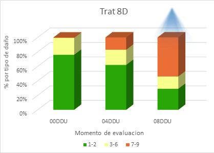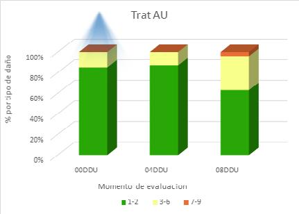 Figura 18. Porcentaje de plantas con daño bajo (daño Davis 1-2, en verde) daño medio (daño Davis 3-6, en amarillo claro) y daño alto (daño Davis 7-9, en marrón) por cada momento de evaluación y en los tratamientos a umbral (AU), a los 4DDU (Trat. 4D) ya los 8DDU (Trat. 8D). El símbolo celeste en forma de cono indica el momento de aplicación de insecticida en cada tratamiento. Fuente: Benedit et al. (2018).