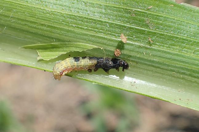 Las larvas pequeñas y medianas (desde emergidas hasta el segundo estadio) pueden raspar la epidermis de las hojas y causar defoliaciones leves (Figura 7). En cambio, las larvas de estadios avanzados (tercero en adelante) pueden cortar plantas pequeñas o provocar defoliaciones que van de leves a severas y también alimentarse de tallos o espigas según el estadio del cultivo. Cuando la larva se introduce en el cogollo produce perforaciones en las hojas enrolladas, las cuales al desplegarse presentan una línea de orificios transversales en la lámina (Figura 8, izquierda). Este tipo de daño puede confundirse con el de la chinche