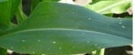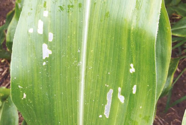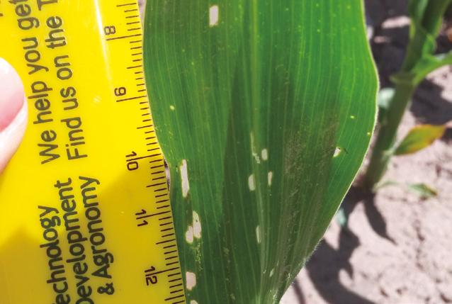Figura 16. Daño Davis 3 ocasionado por Spodoptera frugiperda en el cultivo de maíz. Las áreas comidas (“ventanitas”) no superan los 1,3 cm de longitud y no atraviesan completamente la lámina foliar. Fuente: Monsanto Argentina SRL.