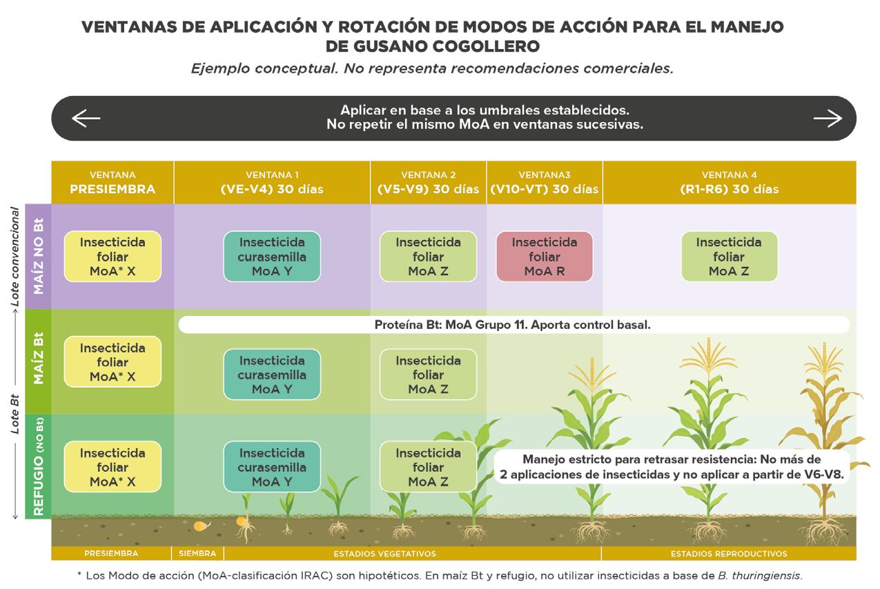 Figura 17. Esquema orientativo de ventanas de aplicación de insecticidas en maíz según estadio del cultivo, eventos Bt y no Bt, y rotación de modos de acción. Fuente: modificado IRAC - CASAFE.
