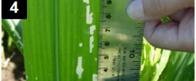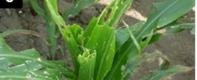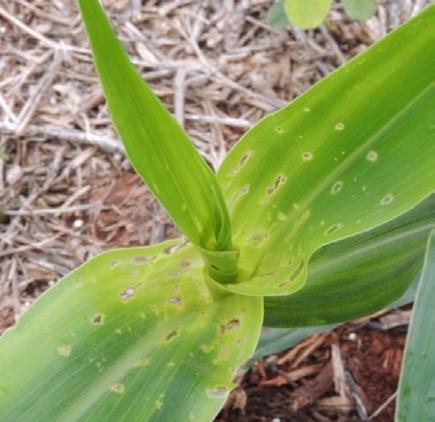 ñas lesiones circulares o alargadas de menos de 1,3 cm sin perforaciones de la membrana (daño 3 en la escala de Davis correspondiente con larvas en estadios L1/L2) y hay larvas vivas aún expuestas en las láminas (Figura 16). Las larvas más grandes suelen alojarse en el cogollo y no son alcanzadas por los insecticidas.