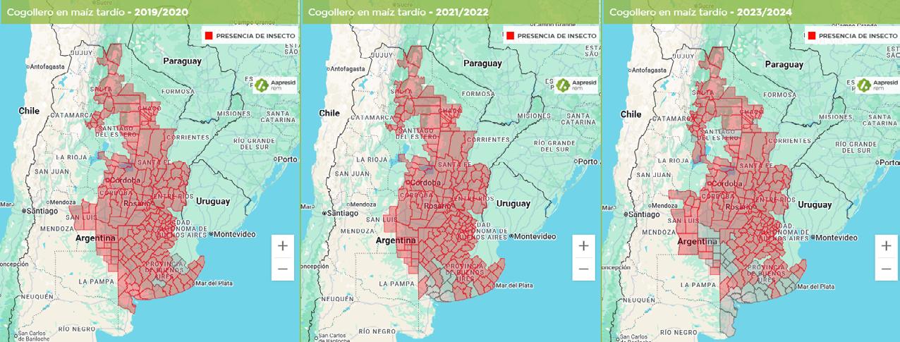 Los registros relevados por la Red de Manejo de Plagas (REM) de Aapresid permiten visualizar la presencia de la plaga tanto en maíz temprano como tardío a lo largo de distintas campañas. Los mapas muestran una recurrencia de reportes en amplias regiones del centro-norte del país, particularmente en el NOA, NEA y norte del área templada, principalmente en siembras tardías, situaciones que combinan temperaturas favorables y disponibilidad continua de hospederos (Figura 2).