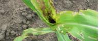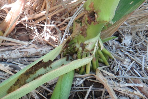 Figura 10. Daños causados por larvas de Spodoptera frugiperda en la base del tallo. Fuente: Roberto Peralta.