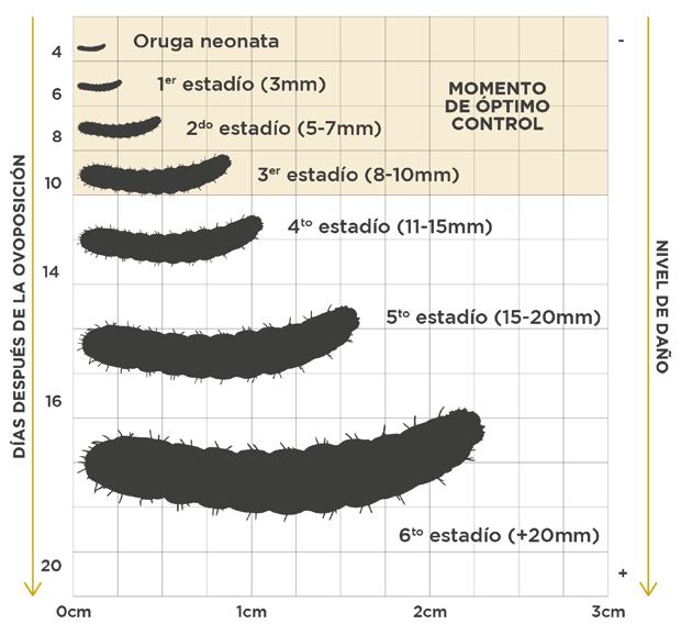 Figura 5. Estadios, tamaños, nivel de daño y momento óptimo de control de Spodoptera frugiperda. Fuente: adaptado de Programa MRI.