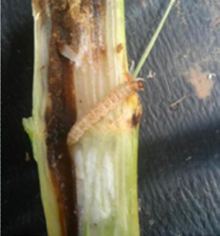 Figura 9. Daño de larvas de Spodoptera frugiperda en tallos (izquierda). Comparación con Diatraea saccharalis (derecha). Fuente: Monsanto Argentina SRL.