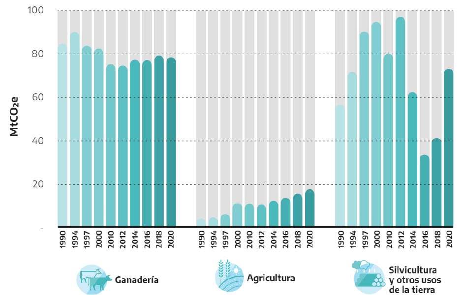 las emisiones provenientes del uso de fertilizantes, quema de biomasa, residuos de cosecha y la producción de arroz, y ha presentado un aumento de sus emisiones desde 2012. Por último, el subsector de Silvicultura y Otros Usos de la Tierra incluye las emisiones y absorciones provenientes de los cambios en el uso del suelo, el manejo del bosque nativo, la silvicultura y los productos de madera recolectada. Este último subsector presenta grandes fluctuaciones generadas por cambios en la legislación vinculada a la protección de bosques nativos y condiciones climáticas.