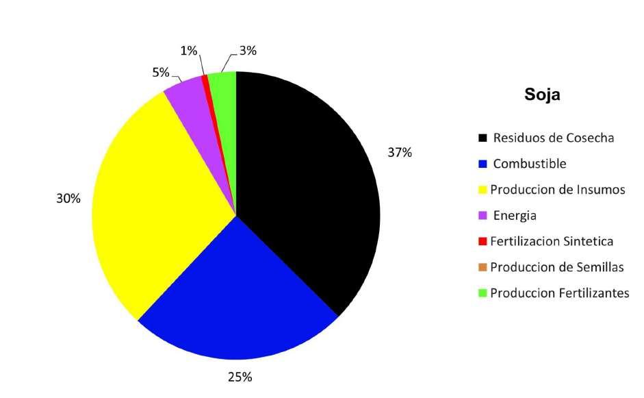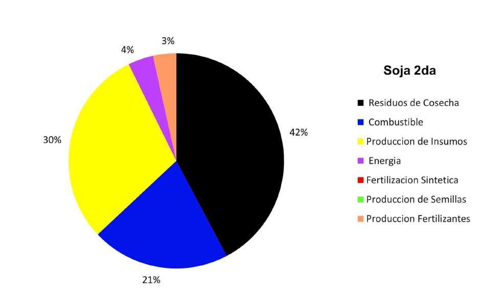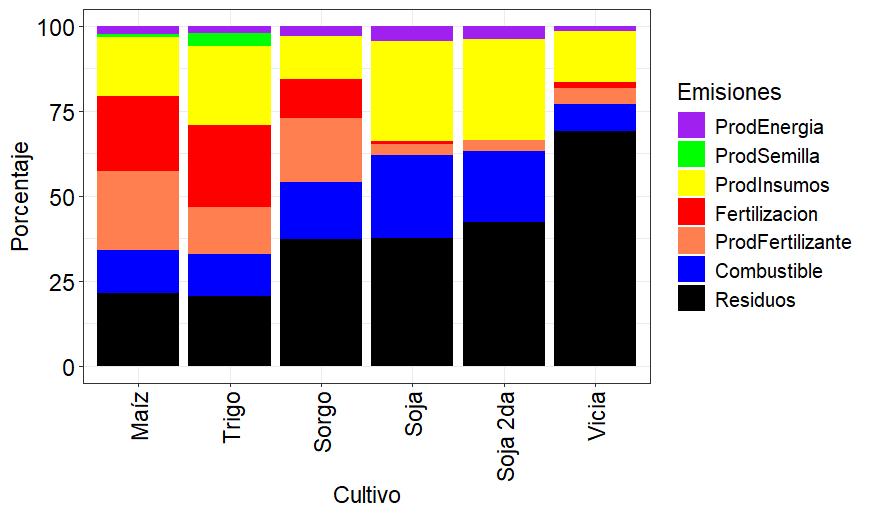 Los siguientes gráficos representan la contribución de las distintas fuentes de emisión en la huella de carbono total de cada cultivo (Fig. 6, 7, 8, 9, 10 y 11). Los mismos están expresados como el % de influencia sobre el total de las emisiones del cultivo de referencia.
