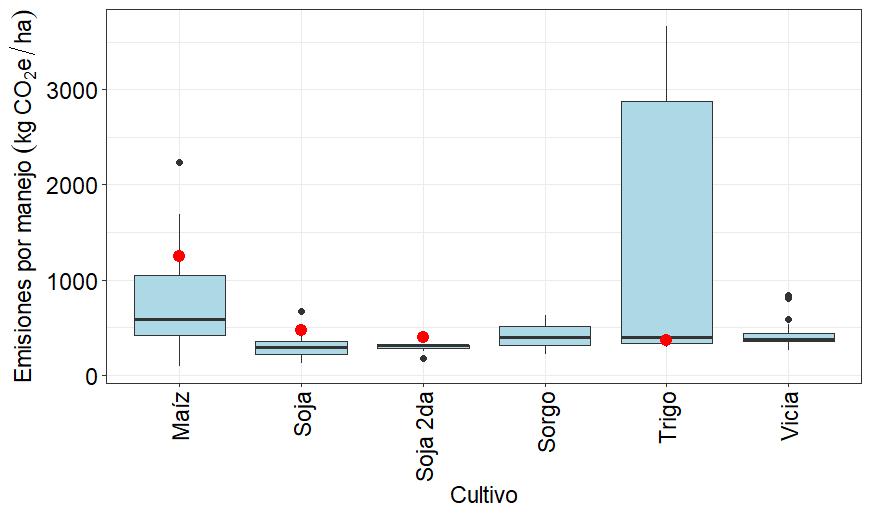 representaron con un punto rojo dentro de cada barra de la Figura 4 (maíz: 1246 kgCO₂e/ha, Bongiovanni y Tuninetti, 2023; trigo: 469 kgCO₂e/ha, Bongiovanni y Tuninetti, 2021; soja: 403 kgCO₂e/ha, ReTAA, 2012-2022, soja 2da: 365 kgCO₂e/ha, ReTAA, 2012-2022).