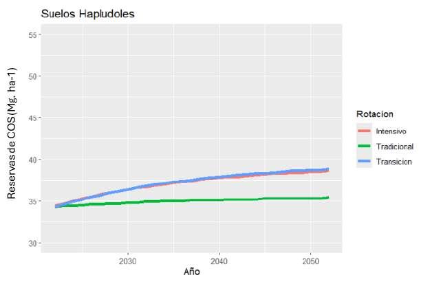 Se proyectó la evolución de las reservas de COS durante 30 años, usando una rotación fija tanto para los lotes intensificados como para los de rotación de tercios, y rendimientos históricos de cada explotación. Vimos que los lotes no intensificados tienden a mantener sus niveles de carbono, mientras que los lotes intensificados aumentaron sus niveles de carbono hasta un límite superior de 52 Mg C. ha-1 para los suelos Argiudoles y de 38 Mg C. ha-1 para los Hapludoles (Figura 3). Sin embargo, debido a las