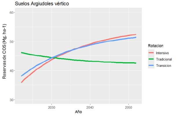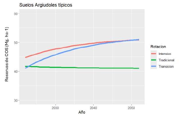 aproximaciones utilizadas y a las incertidumbres inherentes a las proyecciones a largo plazo, es preferible considerar las tendencias de los modelos en lugar de centrarse en valores puntuales. A su vez, es importante remarcar que la estabilización de las reservas en los lotes con rotación tradicional, no toma en cuenta el riesgo de erosión en periodos de barbecho, que puede reducir su calidad con respecto a otros parámetros del suelo.