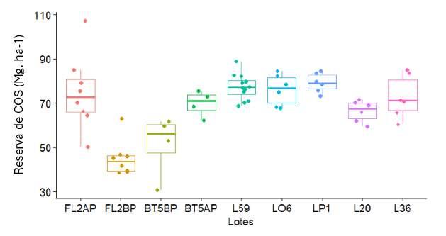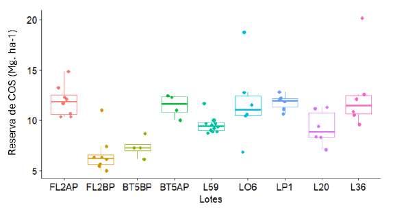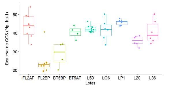 B C DEl análisis de COS hasta los 50cm permite valorar de forma más precisa las reservas de COS en el suelo y distinguir el efecto de los manejos en el mediano y largo plazo. En este estrato adicional (20-50cm), las reservas aportaron entre 24 y 32 Mg ha 1 al contenido total de COS, sin considerar