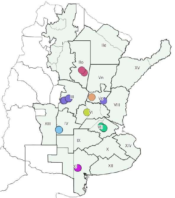 En esta primera etapa exploratoria, seleccionamos establecimientos productivos ubicados en cinco zonas contrastantes (Fig. 1): NEA Oeste (II Oeste), Centro-Norte de Córdoba (III), Sur de Córdoba (IV), Santa Fe Centro (V centro), Núcleo Norte (VI), Centro de Buenos Aires (X) y Sudoeste de Buenos Aires - Sur de La Pampa (XI).