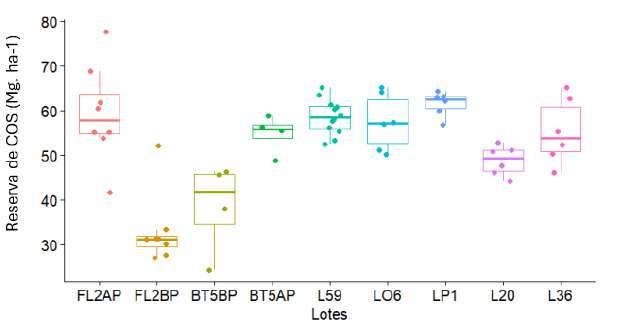 Figura 1. Reservas de COS (Mg C. ha 1) de cada lote a 0-5 (A), 0-20 (B), 0-30 (C) y 0-50cm de profundidad. Lotes FL2 y BT5: Hapludoles; Lotes LO6 y L59: Argiudoles típicos; Lotes LP1, L20 y L36: Argiudoles vérticos.