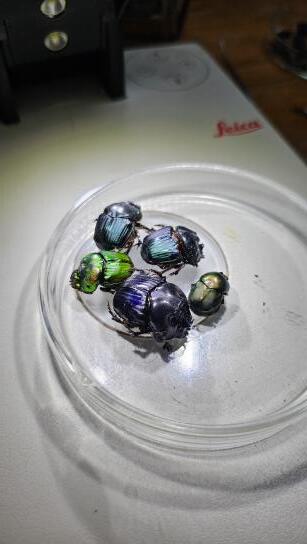Algunos detritívoros capturados en cultivos de servicios. De izquierda a derecha, Sulcophanaeus sp.,