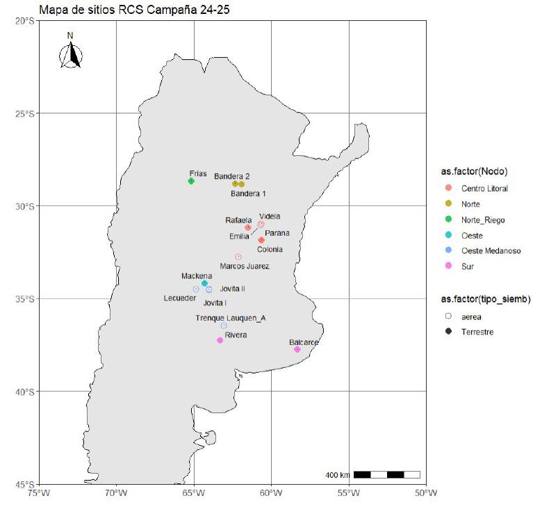 De esta campaña participaron 16 sitios con ensayos experimentales distribuidos en 5 nodos agroclimáticos (Centro Litoral, Oeste, Oeste Medanoso, Norte y Sur) abarcando regiones desde el Norte de Argentina hasta el Sur de la provincia de Buenos Aires (Figura 1). Los sitios se agruparon en nodos según características agroambientales
