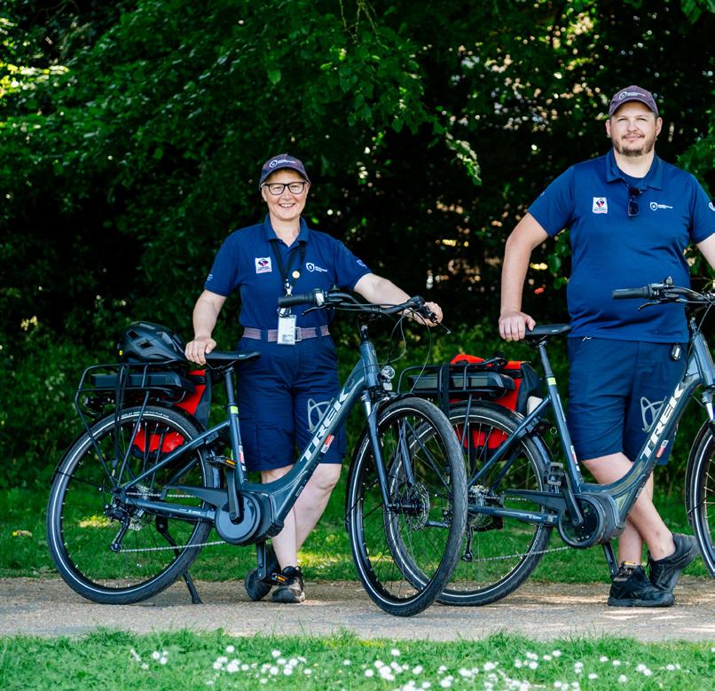 The Horsham wardens differ from those in the villages in that they don’t have a hybrid vehicle to get around in. Instead, they have electric bikes, which allow Maria and Charlie to cover ground quickly, although most town patrols are done on foot. Maria and Charlie choose not to wear high-vis uniform, finding that people confuse them for parking services or Police Community Support Officers (PCSOs) when they do. So, they take a more informal approach, which helps them engage with the public.