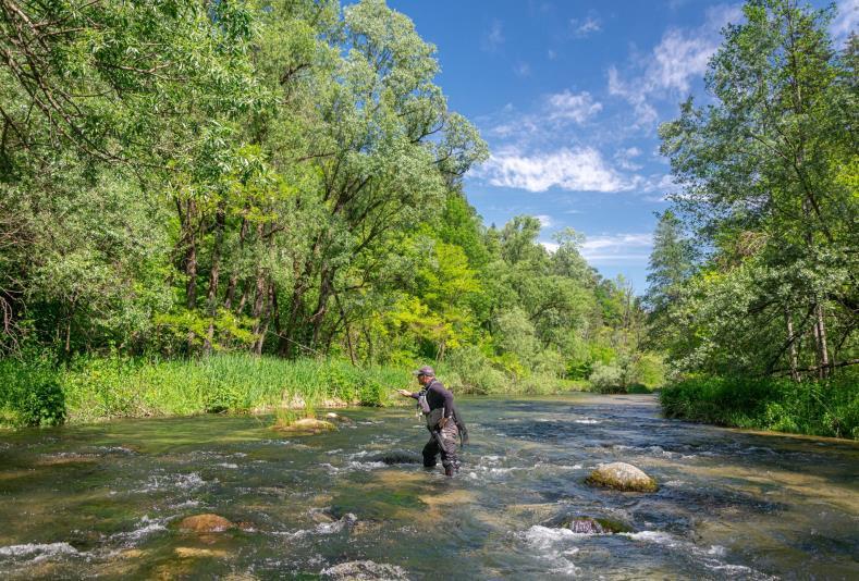 The Kupa River (or Kolpa) forms a natural border between Croatia and Slovenia. It also benefits from the limestone bedrock, but its terrain makes it much more akin to a classic freestone river with anglers enjoying mile upon mile of runs and pools. Wading is essential and can be challenging where the river flows over a rocky riverbed as it carves through forested hillsides. It’s a great spot to target native grayling, smaller brown trout and excellent for huchen (Danube salmon) fishing during the winter season.