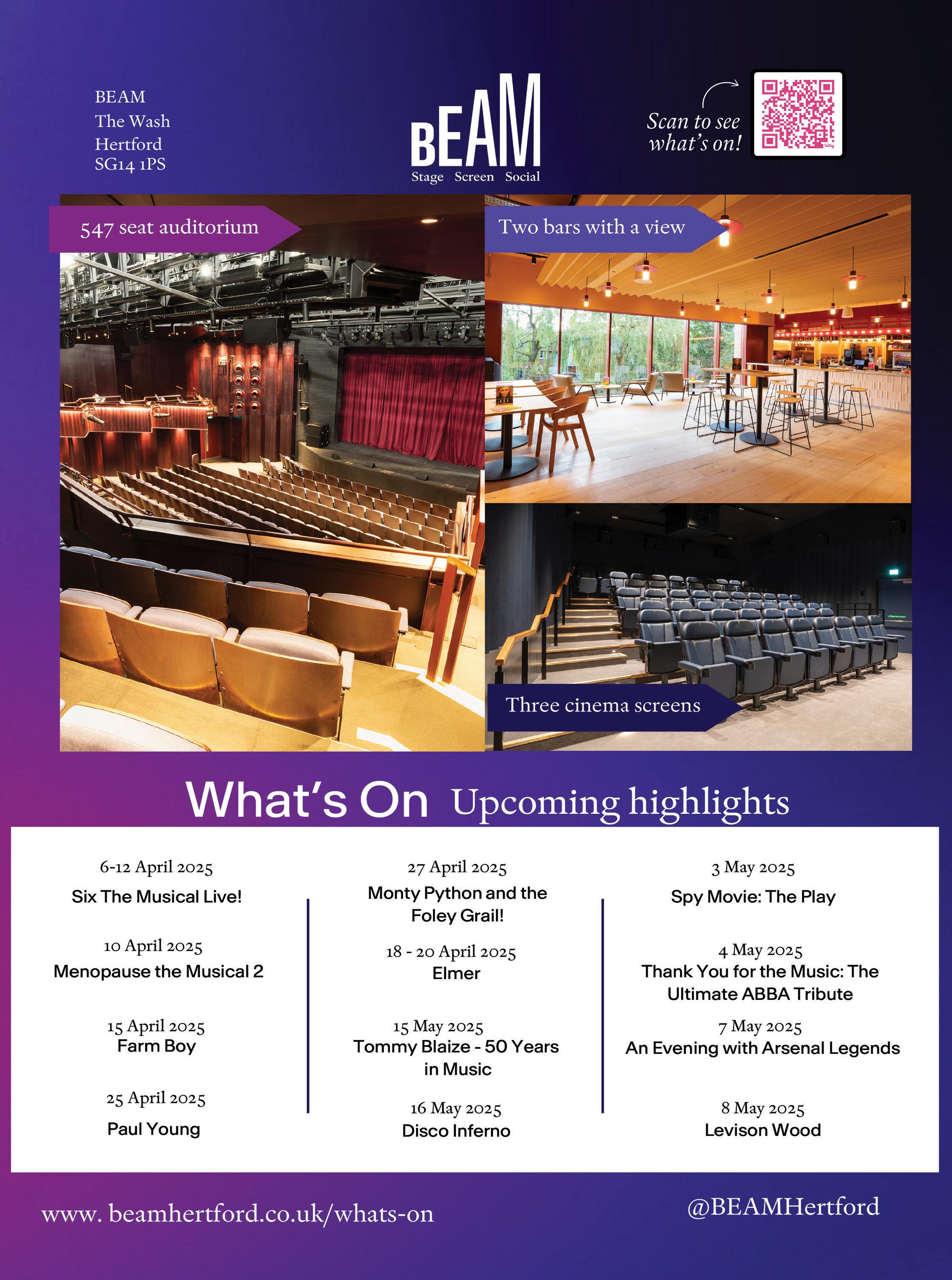 Front cover images (clockwise from top) Works at Hertford Art Society’s Open exhibition by Diane Warburton and Anastasia Olarou (p31); Artist’s impression of the planned Sunset Studios development at Waltham Cross (p5); Stansted Airport, where passenger numbers are set to soar (p8); A Minecraft Movie out this month (p29); Easter egg characters at Hertfordshire Zoo (p20 & 21).