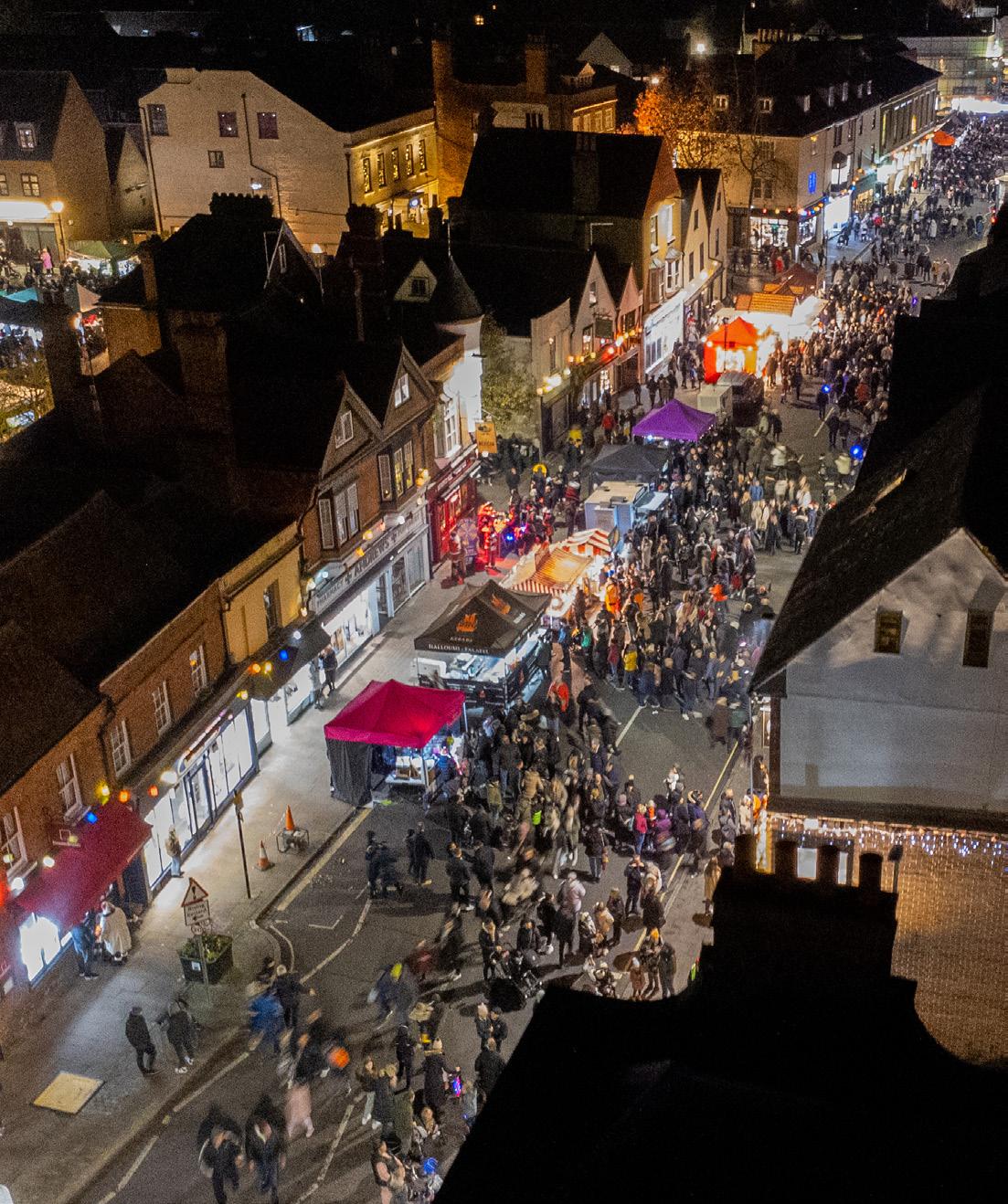 Roads including the High Street are closed to traffic and are taken over by stalls. Most shops remain open and other attractions include markets, a Christmas tree festival and fairground rides.