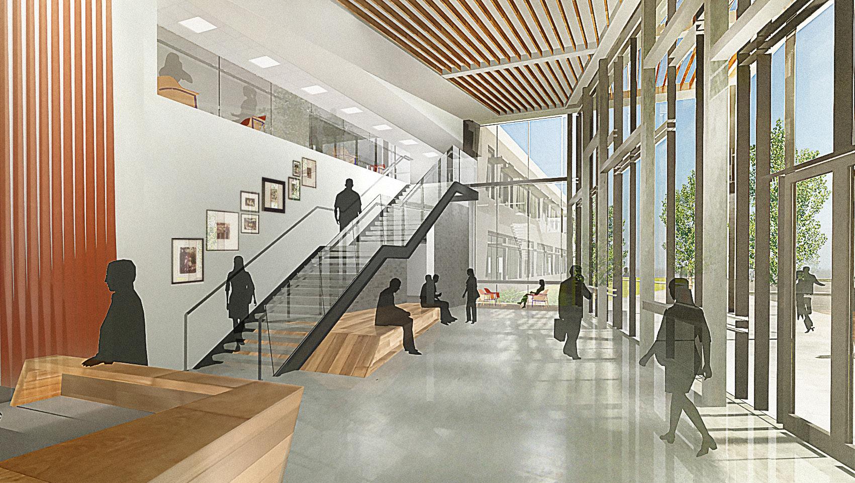 The main entry is placed on the south facade and opens to the main thoroughfare (Lomas Boulevard) with a large entry court and drop-off. This helps with way-finding and opens the campus to the street. The overall building massing is of more solidity, referencing the vernacular of Albuquerque, with punched windows and areas of high transparency to aid in connectivity and way-finding. The tower portion is clad in copper metal panel, with a specular quality to reflect the colorful sunrise and sunsets of the region. The copper also references the Puebloan jewelry using turquoise and copper. The base will be an off-white, cementitious stucco matching the adjacent buildings.