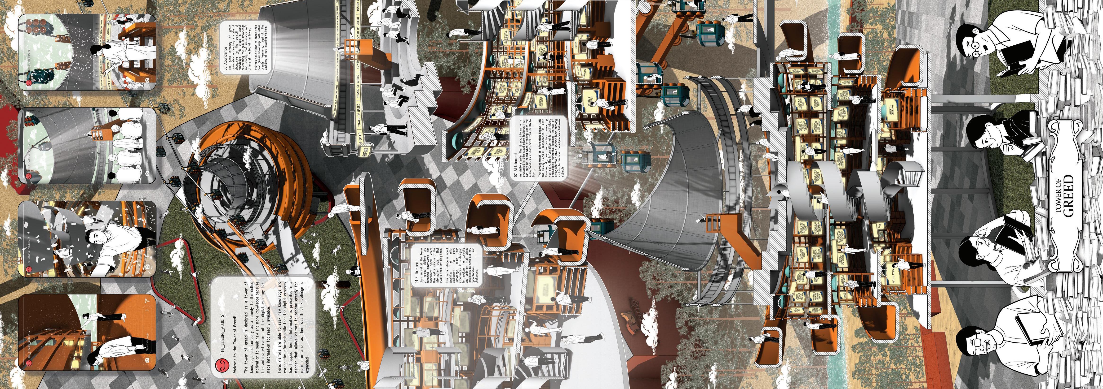 The tower of greed is designed as a tower of knowledge and curiosity as a remedy to the dulled motivation to seek new and more knowledge because the automated nature of the digital economy has made information too readily available.