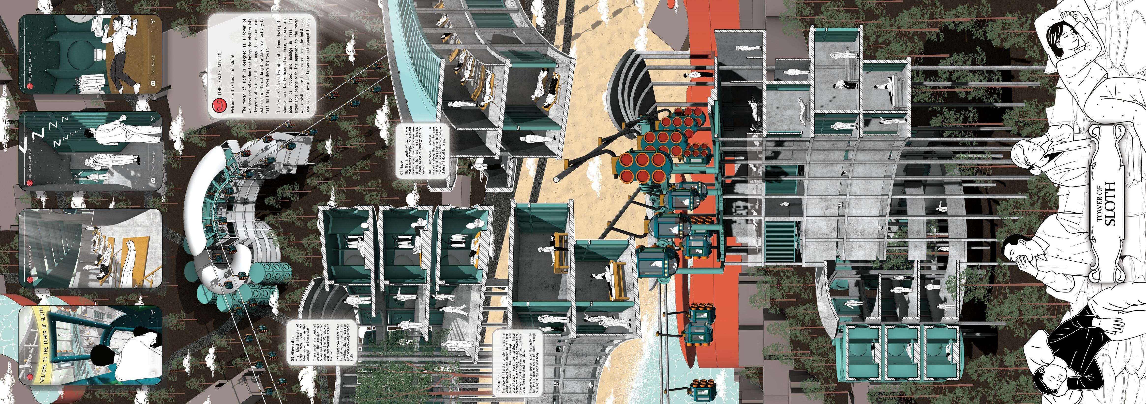 The tower of sloth is designed as a tower of wellness and relaxation that brings the visitors into deeper states of sloth. It brings the visitor from external to internal, bright to dark, from activity to rest, as they move down the tower.