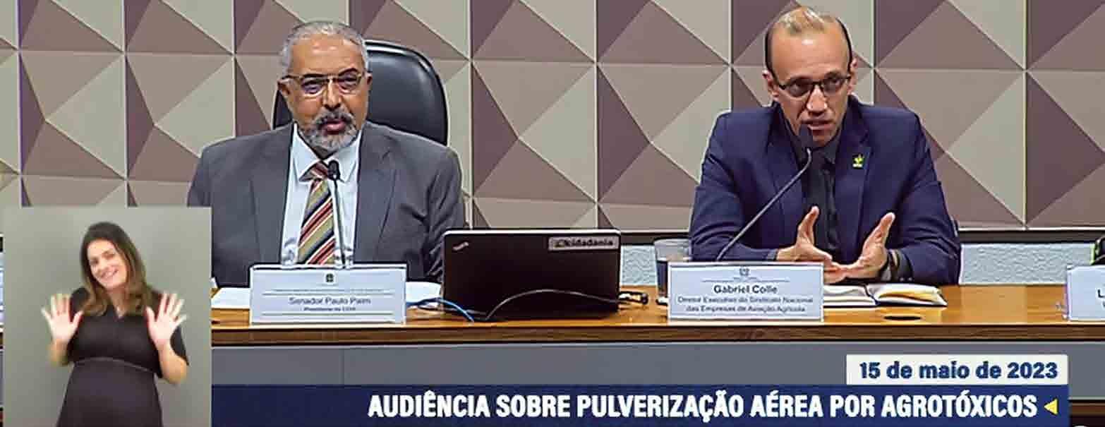 edição, nas páginas 30 a 32. Ela narra como o Diretor Executivo do SINDAG Gabriel Colle foi a uma sessão da Comissão De Direitos Humanos do Senado sozinho e sem convite (tratava-se de audiência pública) para ser a única voz a defender a aviação agrícola brasileira contra representantes de várias associações, incluindo uma chamada “Fórum Nacional de Combate aos Impactos dos Agrotóxicos e Transgênicos” e outra chamada “Campanha Permanente contra os Agrotóxicos”. Como "a palavra" é parte de seus nomes, não tivemos outra opção senão imprimi-la. Ela também aparece na foto tirada da tela de um telejornal, a qual ilustra o artigo