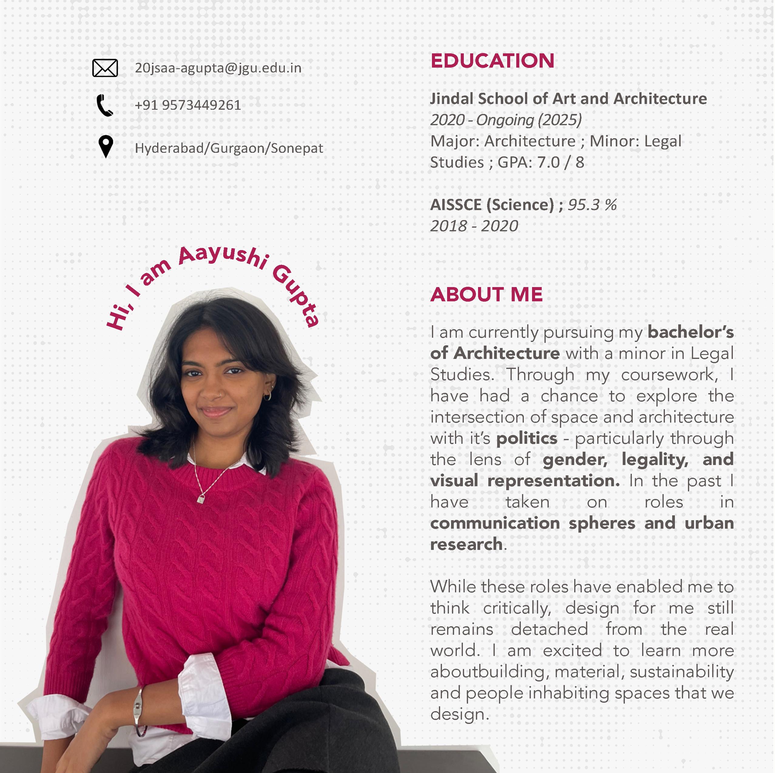 Hello, I am Aayushi Gupta an undergraduate student of the built environment. I have worked with communication design and research in the past. I am interested in alternative construction technologies, design as research and interdisciplinary collaborations. Please find attached some of my selected works.