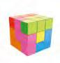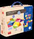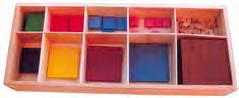 Este conjunto contiene 84 piezas de madera, 7 de cada forma y medida en todos los colores del arco iris, y una bolsa para guardalas.