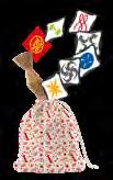 Conjunto de 20 piezas de madera de formas variadas y una bolsa para guardarlas.