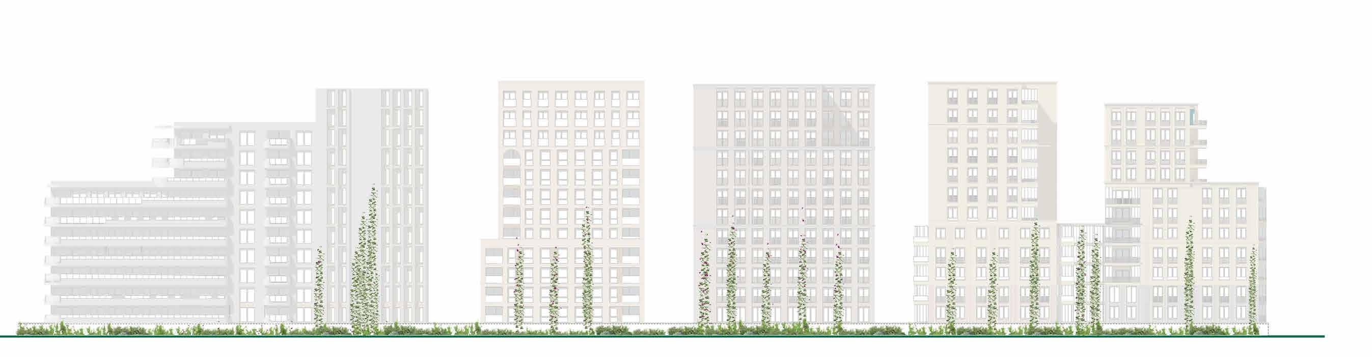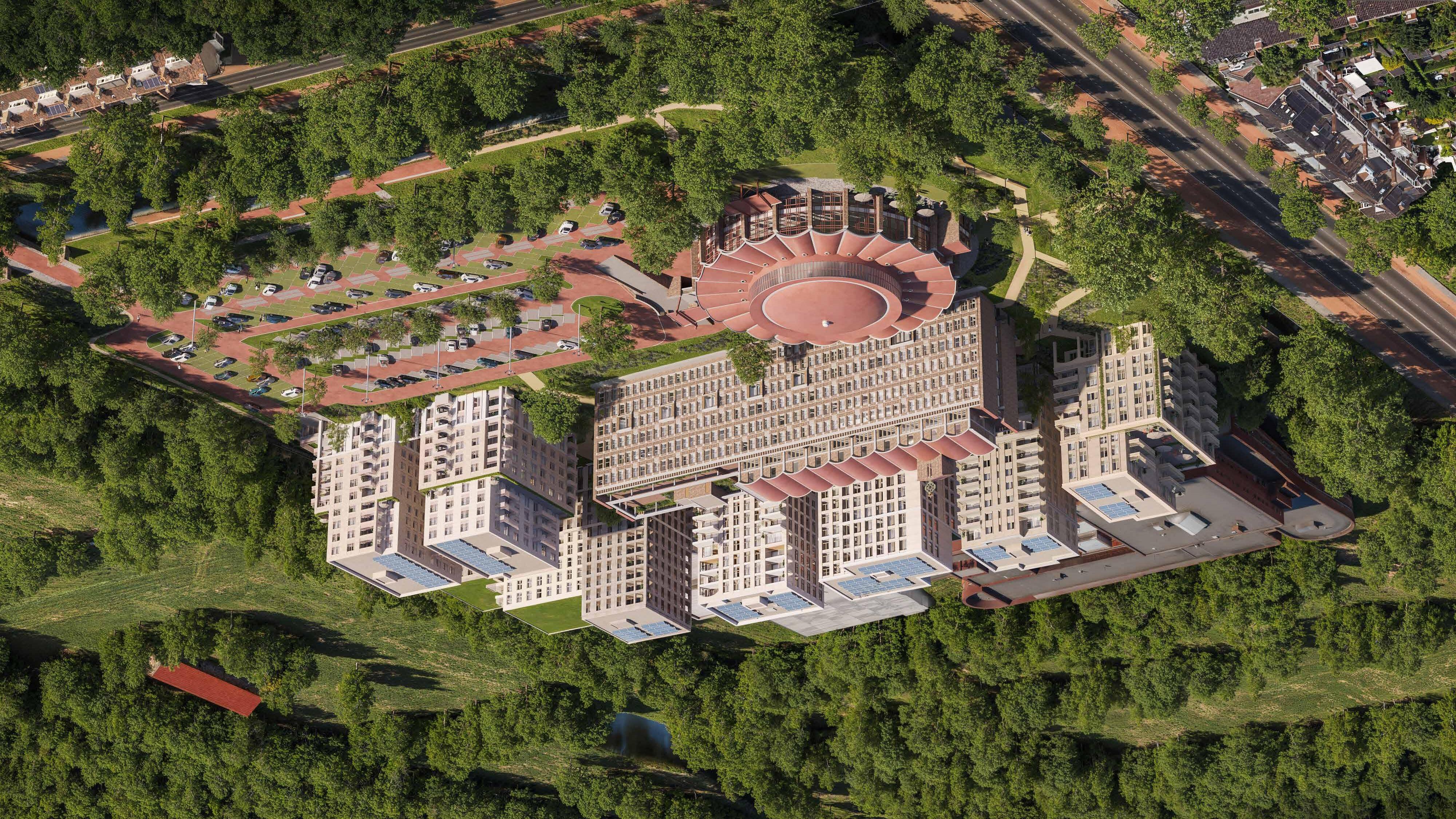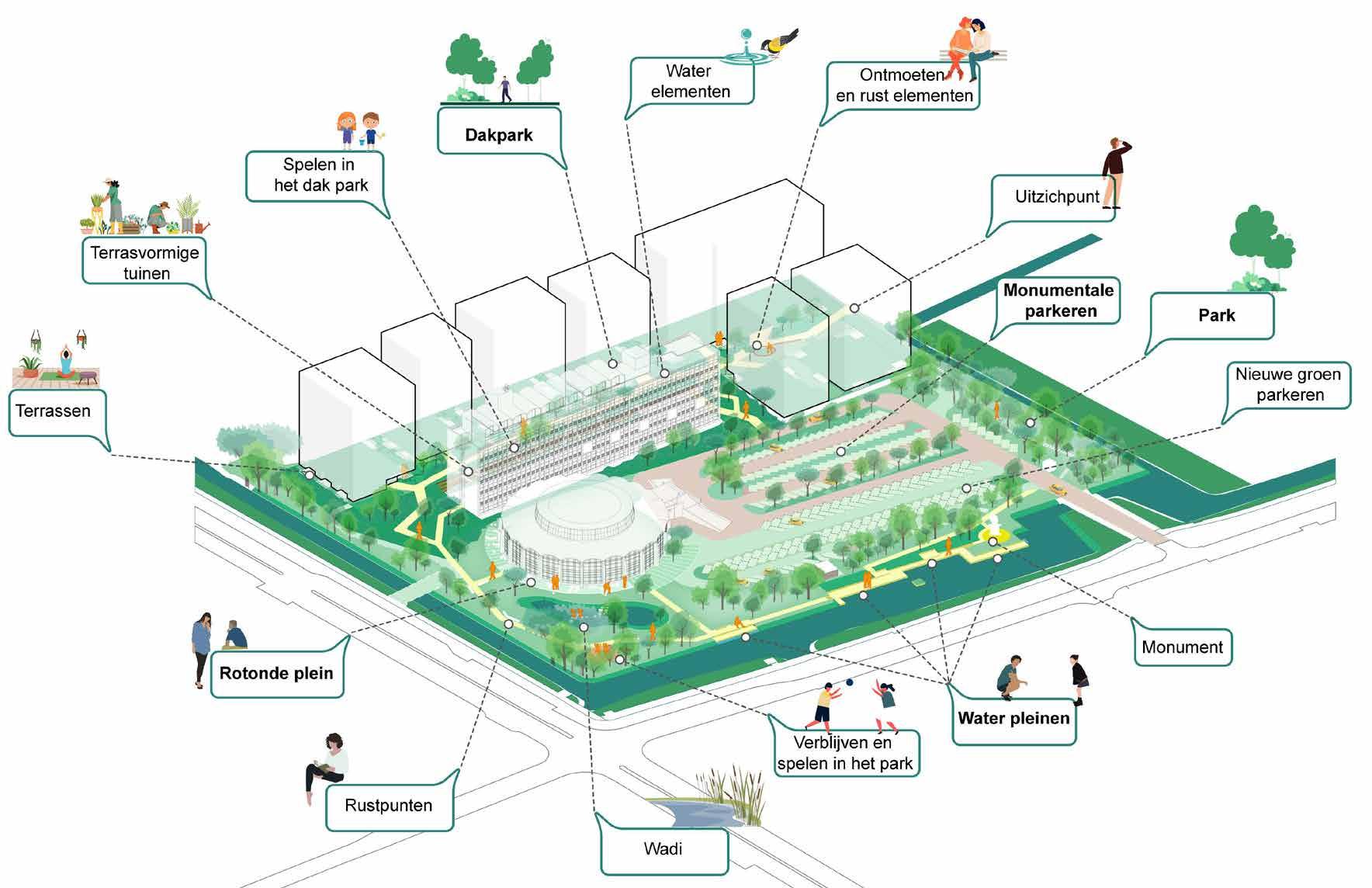 Circa 225 parkeerplaatsen komen te vervallen, doordat deze onder de gebouwen worden gesitueerd. Het vrijkomende gebied wordt ingevuld met groen.