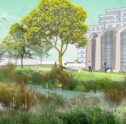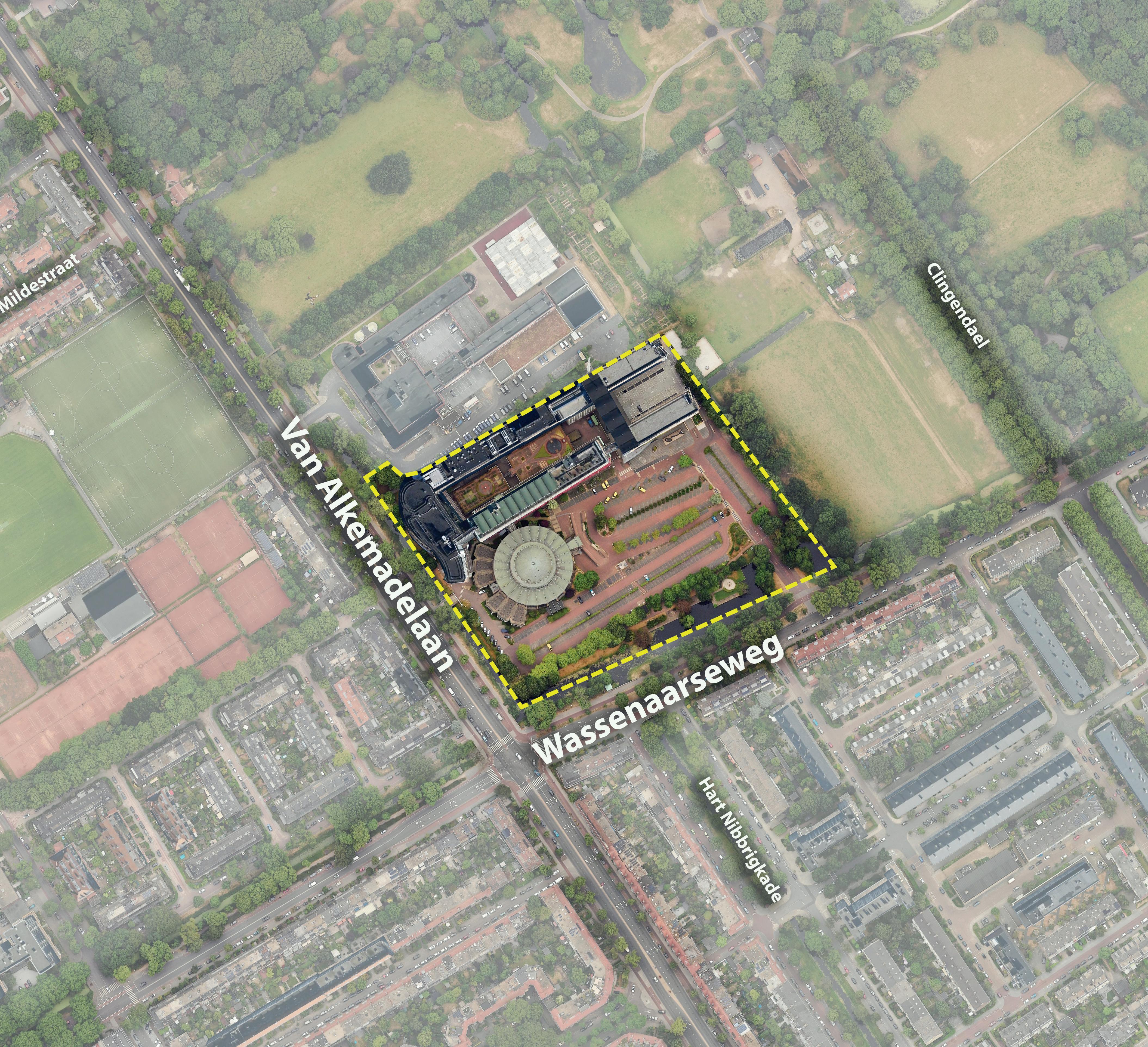 Gebouw langs de Van Alkemadeweg en de bebouwing tegen de Rotonde komt te vervallen. Dit gebied wordt groen ingericht.