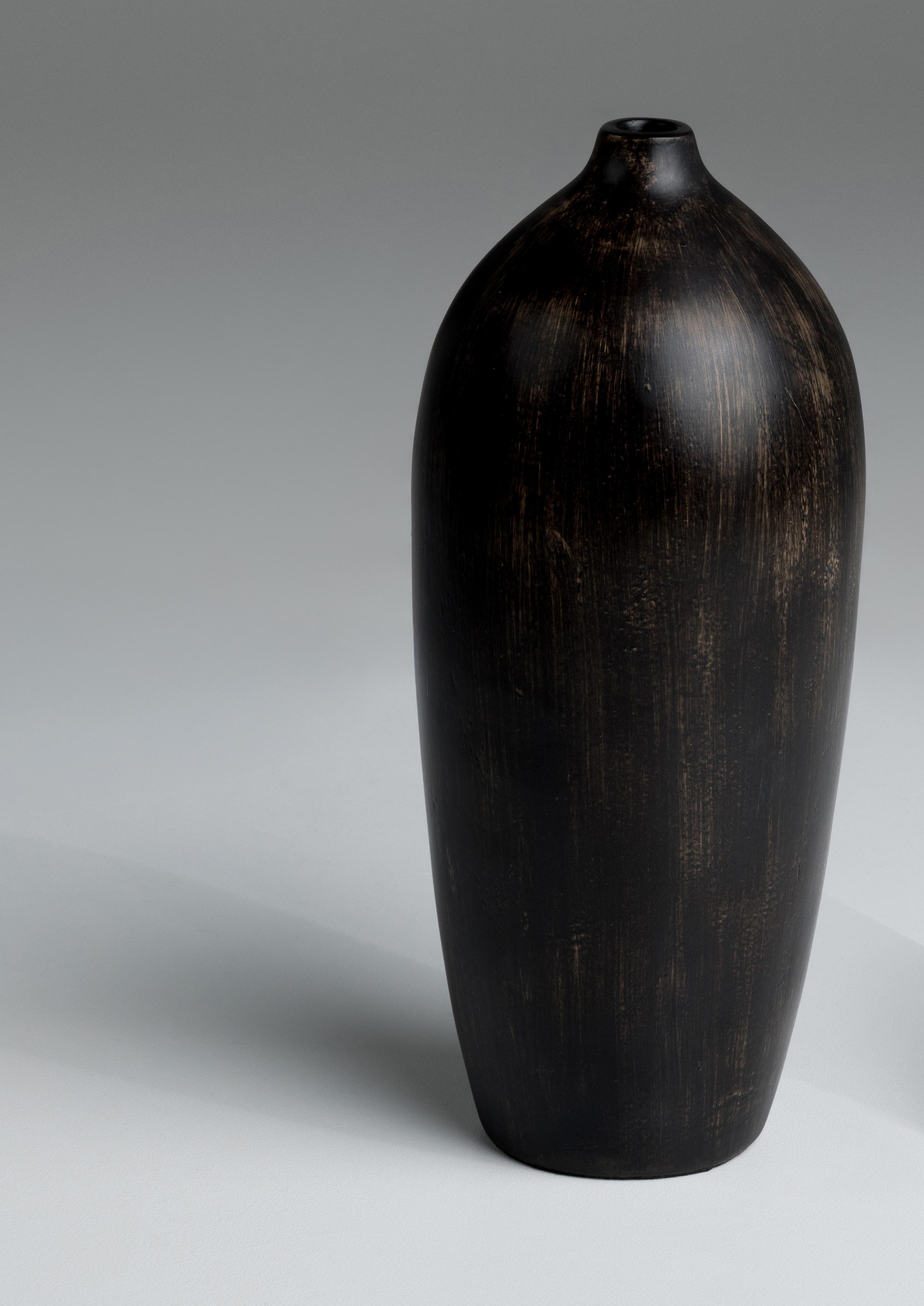 Defined by its minimalist form and dramatic finish, the Huxley Collection brings sculptural presence to any interior. Crafted from poly resin and hand finished in a rich black wash, each vase showcases a burnished texture that catches the light with subtle sheen.
