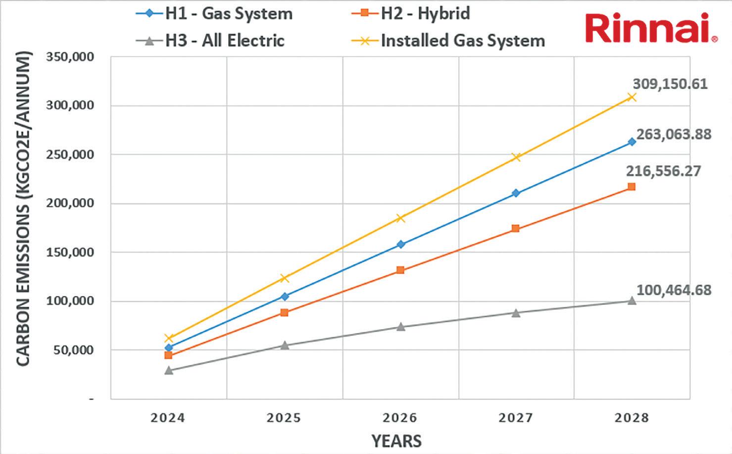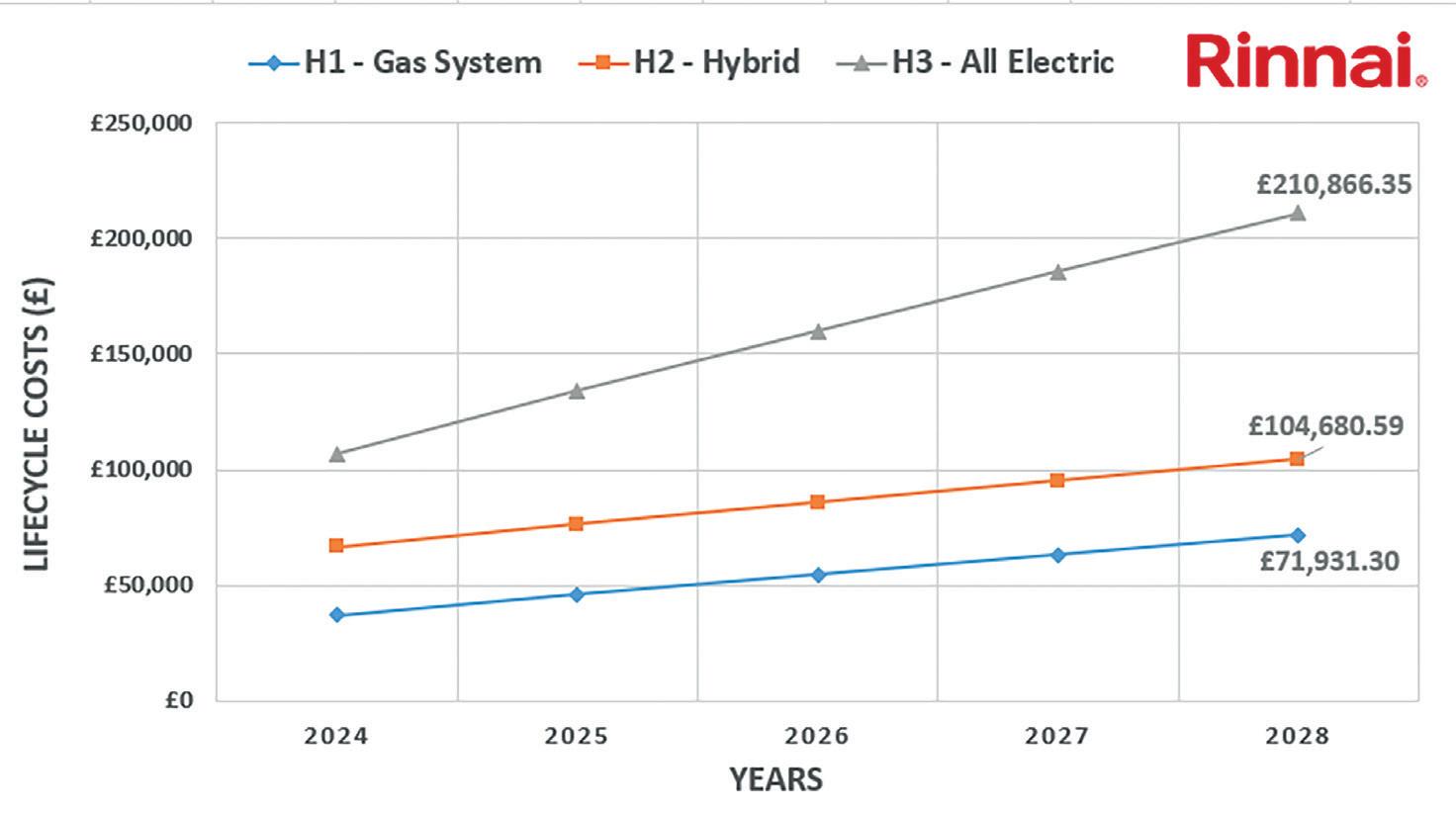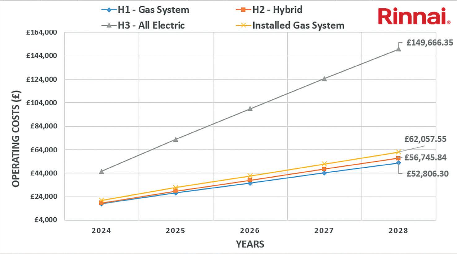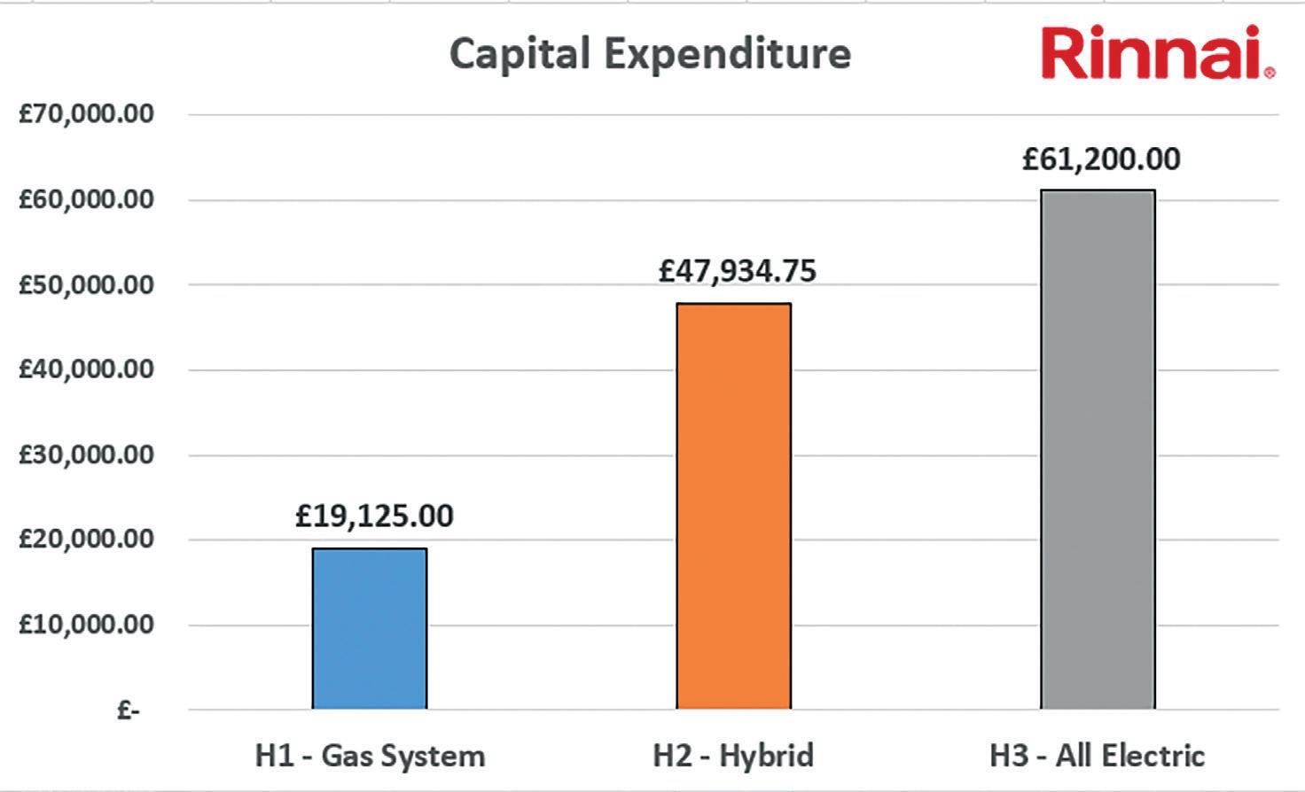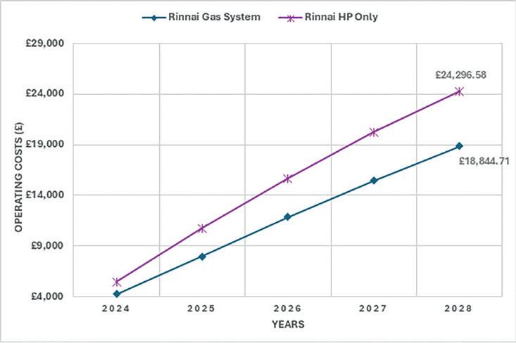 Figure 5 also details the cumulative running costs over a 5-year period. The OPEX costs are compared to a Rinnai N1300 natural gas appliance.