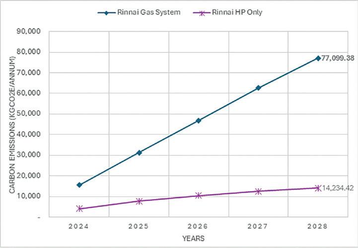 Figure 4 details the amount of carbon reductions made possible through installing a Rinnai high temperature heat pump when compared to a natural gas powered N1300. Rinnai’s gas system is represented in blue whilst Rinnai’s High Temperature Heat Pump is highlighted in purple.