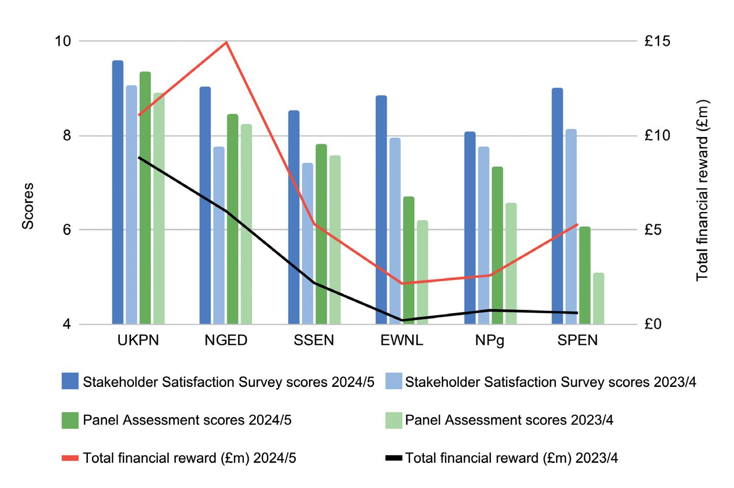Financial rewards show the greatest variance of all. They are determined by the two assessment components and the size of the customer base served by the operators. Hence, small increases in satisfaction or panel scores can be worth more for larger operators like UKPN and NGED (each serving around 8 million customers) than for smaller DSOs, which serve roughly 3 million customers. The result is an uneven playing field: smaller DSOs have to deliver broadly the same upgrades but the financial upside is lower, even when performance improves by the same amount.