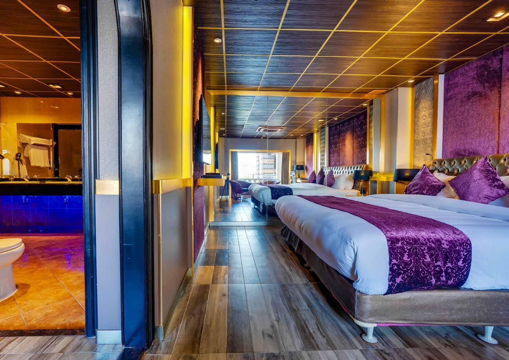 The Party option is the ideal accommodation for the true party animal. The suite is designed in an open layout creating the impression of an open extravagant playground highlighting the fun party amenities in every corner of the room, including the main feature of a 6-7-seater bar with striptease stage