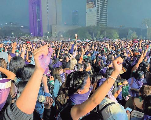 LA LLUVIA NO DETUVO A LAS MUJERES , pues con pañuelos morados amarrados al cuello, carteles entre las manos y consignas que se repetían como eco entre las calles del centro de Monterrey, un total de 17 mil mujeres salieron este domingo a marchar en el marco del Día